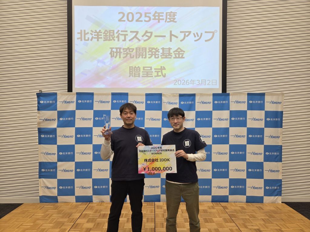 株式会社IDDK(本社:東京都江東区、代表取締役 上野 宗一郎)は、北洋銀行が実施する「北洋銀行スタートアップ研究開発基金」において、応募総数36件の中から厳正な審査を経て、受賞10社のうちの1社として選定されました。本日、札幌市内にて授賞式が執り行われましたことをお知らせいたします。